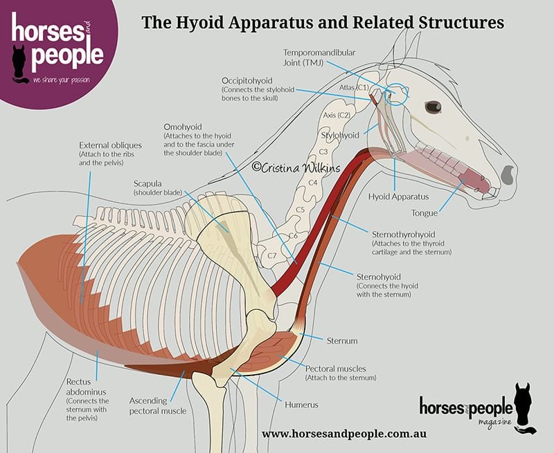 Os músculos esterno-hioideus e esternotireoidiano conectam diretamente a língua e a boca do cavalo ao peito do cavalo. Essa conexão fascial e muscular continua através dos músculos peitorais ao longo da face ventral do cavalo, ao longo dos músculos abdominais e na pelve.